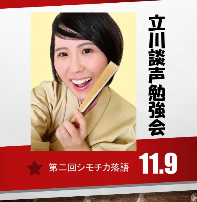 | 日時 | 2025年11月9日(日) 14:30 開場 15:00 開演 16:30 終演 16:45 立川談声さんを囲んで談話会(2ドリンク、プチおつまみ付き) 18:00 全終了 |